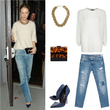 Con un vaqueros de estilo 'boyfriend' y detalles muy chic, el look de Rosie Huntington para disfrutar de una cena junto con su novio, nos ha conquistado. La modelo combina unos jeans anchos y con rotos con un jersey de lana crudo, maxi collar dorado, clutch con detalles 'glitter' y zapatos de salón en un tono azul intenso.